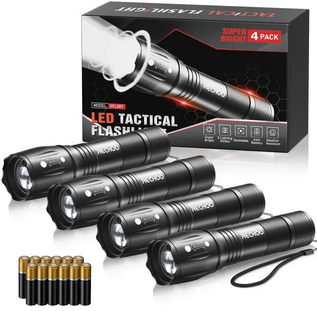 Adjustable Focus, Adjustable Light Modes, Durable, Weatherproof, 40 hours, Aluminum, NiMh, 3, 4.25 L x 1.25 W x 1.25 H inches, 0.358 kilograms, waterproof, Bright LED flashlights*4, 1 year no question refund or warranty form purchase., RECHOO, SFL007-4P