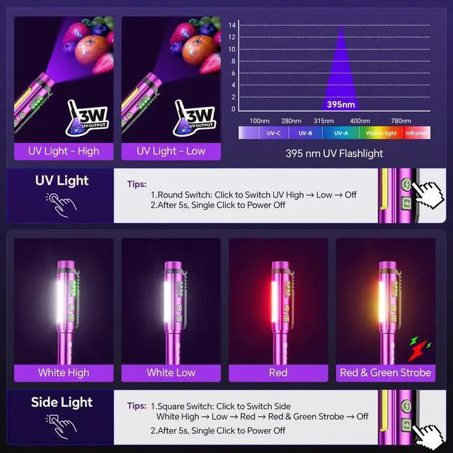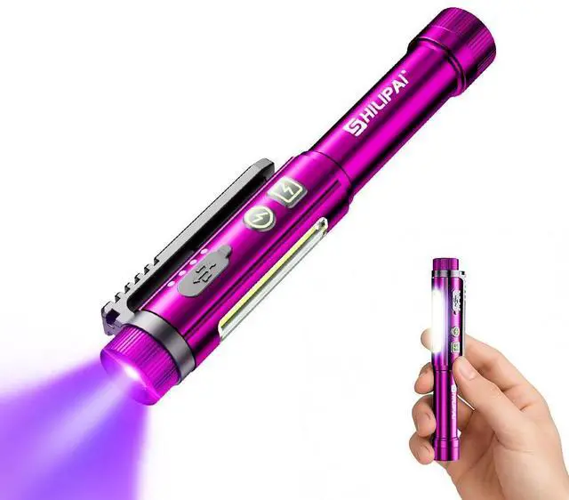 Multi-function Pen LightThis compact and portable pen flashlight features both 395nm UV purple light and 600-lumen COB white light, controlled separately by two buttons. Ideal for various situations like home emergencies, outdoor adventures, and professional inspections. Mini size makes it easy to carry anywhere as a reliable lighting tool.