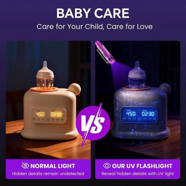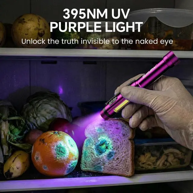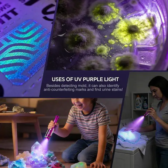 UV FlashlightEquipped with multi-layer filtered optical lenses to deliver pure ultraviolet light. Perfect for home use: detecting pet urine, cat ringworm, assisting in baby bottle cleaning, and nail gel curing. Great for outdoor activities: scorpion and insect spotting, mineral exploration, rock hunting (e.g., jade, sodalite, flint). Also suits professional fields: resin curing, refrigerant leak detection, checking counterfeit money/documents/jewelry, and uranium glass inspection.