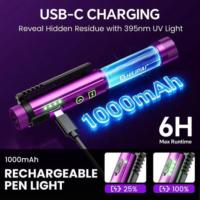 Long-Lasting 1000mAhThis small pen light built-in 1000mAh rechargeable lithium battery with Type-C charging, providing up to 12 hours of continuous operation. The battery indicator shows power status at a glance, so youre never caught off guard by low battery.