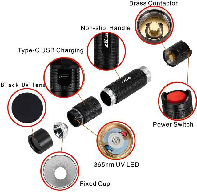 Enhanced 365nm UV Flashlight: Unlike other UV light, our black light flashlight employs 365nm wavelength for superior fluorescence detection. Its large lamp cup area effectively filters out ambient light, providing improved detection accuracy. The lithium battery is pre-installed and charged using the USB Type C interface which is provided.