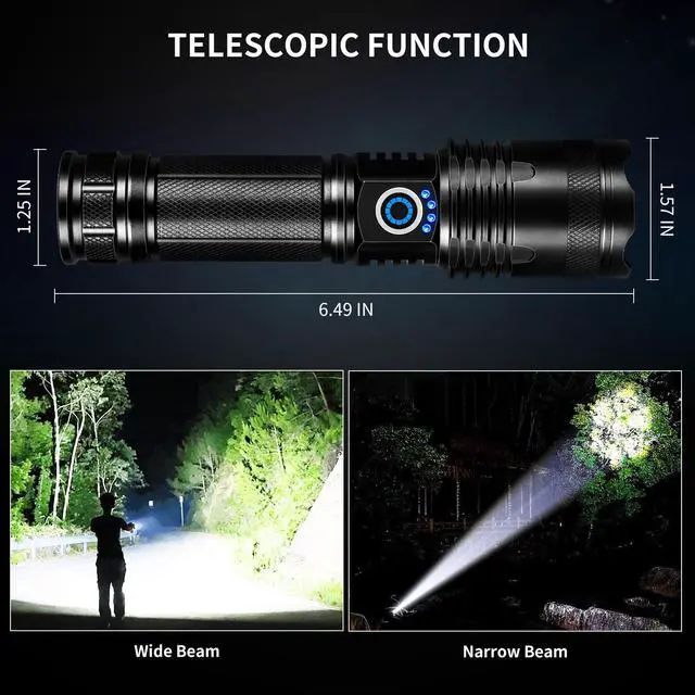 The led super bright hand flashlight can be adjusted by pushing and pulling the head, the floodlight can be used for close range lighting such as dog walking and patrolling, and the spotlight is used for long range lighting up to 3280 feet.