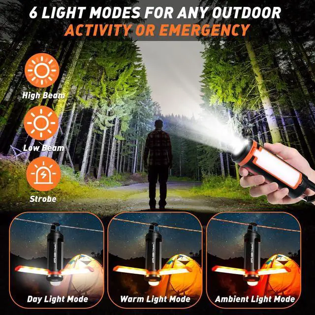 6 Adjustable Rechargable Lamp Light Modes + Foldable Panels- Switch easily between high beam, low beam, strobe, daylight, warm light, and ambiance mode for reading, tasks, or wide-area lighting.