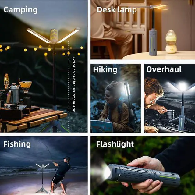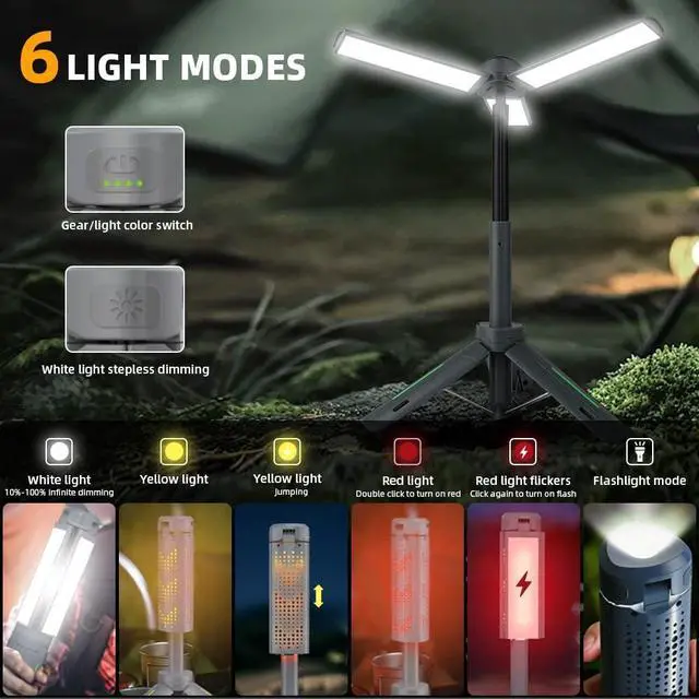 Stepless Dimming & High Lumen: (Excluding Red Light modes) Long press for stepless dimming, allowing brightness adjustment from 10% to 100%. Each panel of this LED camping light emits 1000 lumens, totaling 3000 lumens. and the flashlight mode delivers 450 lumens. It illuminates an area of approximately 4306 sq ft (400). Adjustable brightness ensures optimal lighting. it provides you with sufficient brightness to enjoy your dinner in the camp.