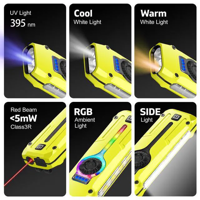 Multifunctional EDC Flashlight All-in-One Lighting ToolThis EDC flashlight packs cool & warm white light, RGB, UV, and red beam into one compact body. Whether you need versatile lighting for work or play, this everyday carry flashlight has you covered.