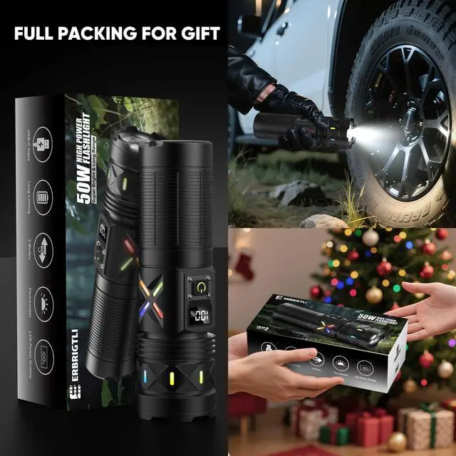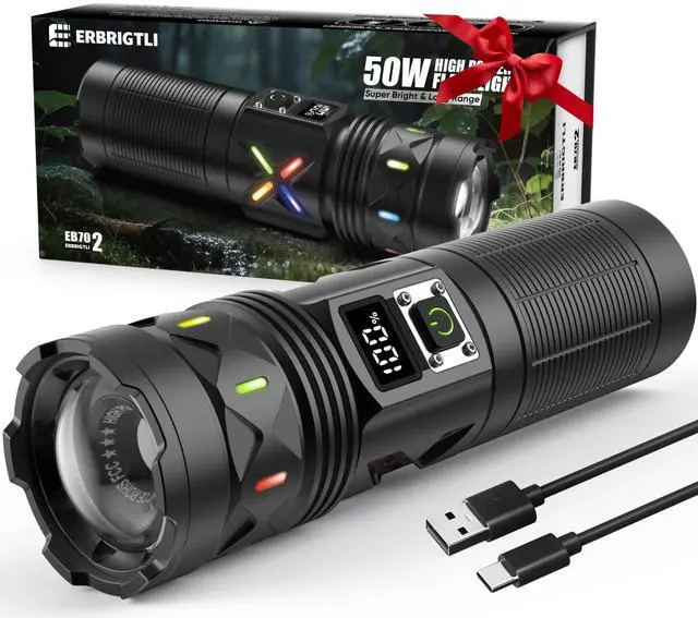 Adjustable Light Modes - 3 Modes(High-Low-Strobe), Adjustable Focus - Long Range up to 5000FT, High Lumens -High Power 50W LED, Rechargeable - USB C Input & Output with LCD Display, 15 hours, Aluminum, lithium_ion, 1.96 L x 1.77 W x 6.89 H inches, water_resistant, 1* High Power Flashlight(Built-in Rechargeable Battery), 1 year replacement., erbrigtli, EB702 Rechargeable Flashlights