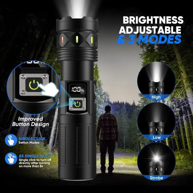 [ SINGLE CLICK 3 MODES - SUPER BRIGHT 100000 Lumens & BRIGHTNESS ADJUSTABLE ] The ERBRIGTLI LED flashlight rechargeable USB C is 3 modes, high and low mode with strobe for emergency. It is easy to adjust the correct brightness you need according your situation. If it is turned on over 8s, just single click the button,it would turn off diereclty. Dont need to cycle all modes. The highest brightness can be up to 100000 Lumens, it can easily illuminate a whole room and backyard of 500 square meters.