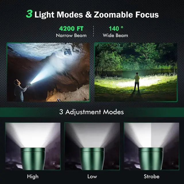 [ 990,000L High Lumens 140° Wide Beam Flashlight] Equipped with upgraded efficient laser Chip LED chips, Sogidon rechargeable flashlight emits a stable and super bright lighting. Since the light penetration is stronger than other same-level lamp beads', its beam can pass through dust and fog well, especially suitable for foggy and rainy days with low visibility. It can illuminate a 140° Beam Angle or focus on objects up to 4200 feet away.