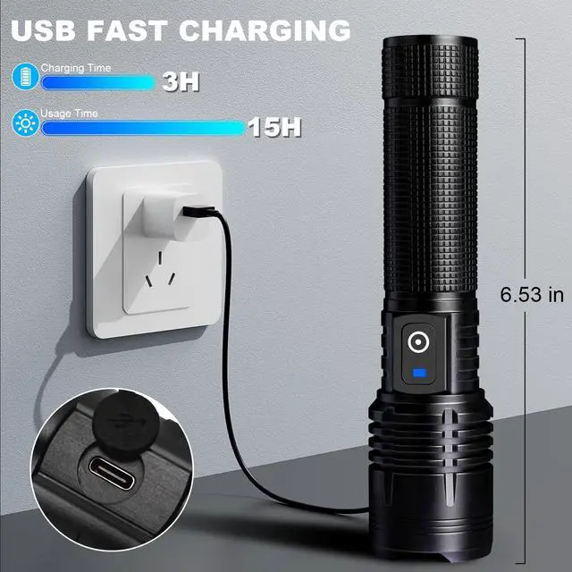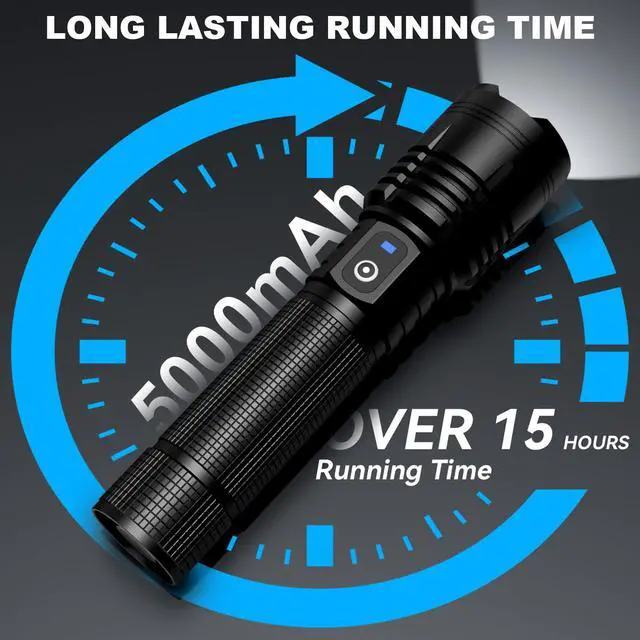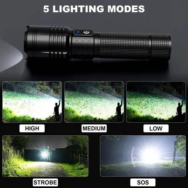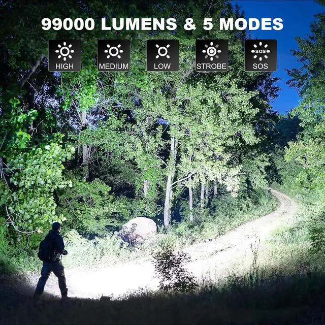 Lylting super bright flashlights rechargeable with built-in upgraded M084 chip, with 5 lighting modes and can reach 99,000 lumens, it can accompany you forward in the darkness to light up everything in front of you.
