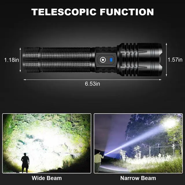 - Narrow Beam: Retract the flashlight head to get a large-area floodl?ght with a brightness of up to 99,000 lumens.