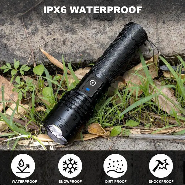 - The high-powered flashlight is made of high-quality aluminum alloy, anodized and hardened for excellent hardness, abrasion resistance, and drop resistance. It can work well even if it is run over by a car or dropped from a height of 10m.