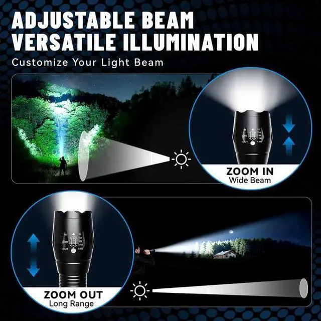 ADJUSTABLE FOCUS & 5 LIGHT MODESimply extend the flashlight to adjust the beam focus to your needs. The powerful Flashlight enables seamless switching between a broad floodlight for large areas and a sharp spotlight for long-distance visibility. It offers five selectable lighting modes: High, Medium, Low, Strobe, and SOSdesigned for maximum convenience in any situation.