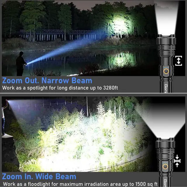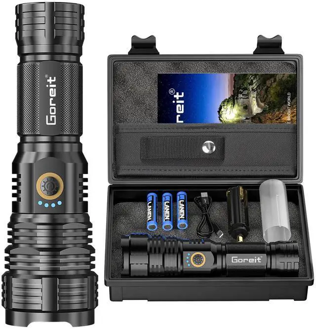 - Goreit G1915 Super bright flashlight has powerful output of 20,000 lumens. Floodlight is for large-area and the spotlight for long-distance. This flashlight also can focus in on objects up to 1600 feet away!