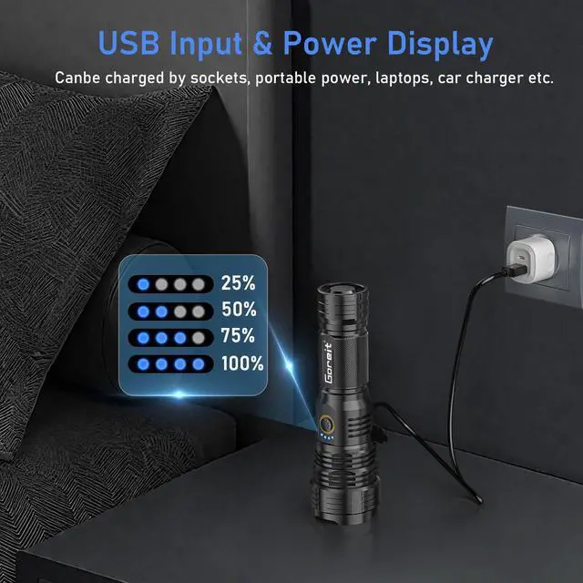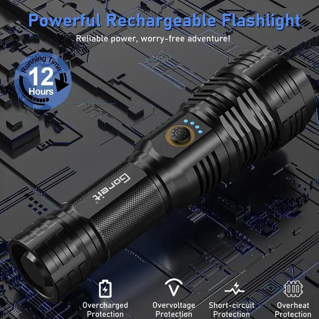 The rechargeable flashlights has been completely upgraded, the ultra-wide beam lasts for up to 12 hours of lighting in medium brightness mode. It provides overcharge, overdischarge and overvoltage protection, which is safer to use, and its service life can reach 100,000 hours.
