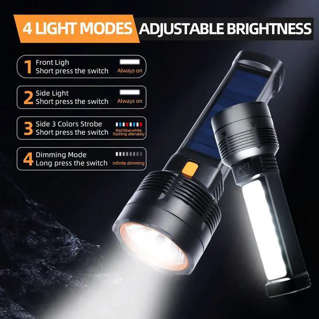 3.Dual Charging Freedom – Stay powered with both solar energy and USB charging. Never run out of light—renewable energy or any USB device keeps you ready.