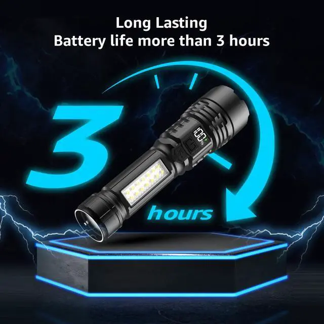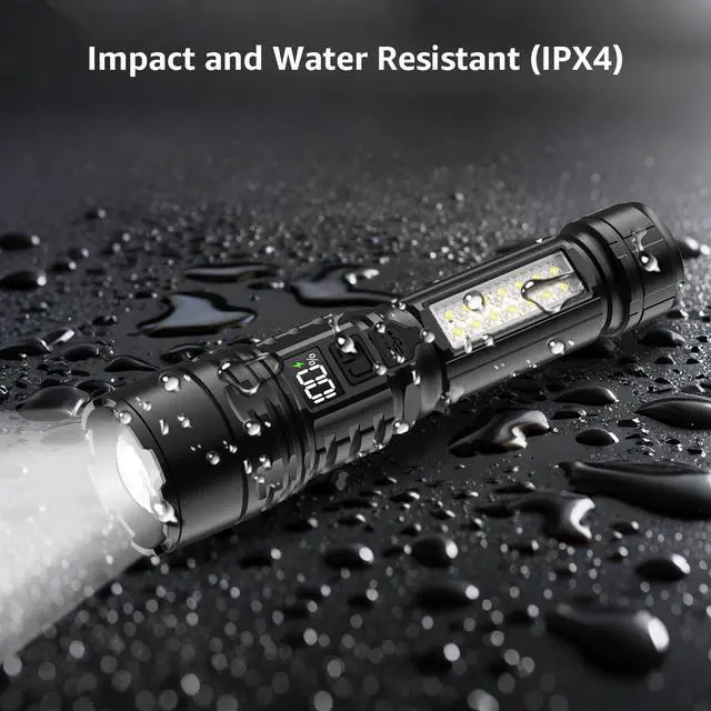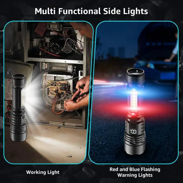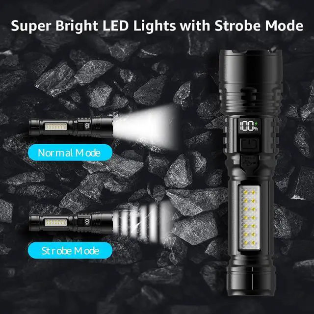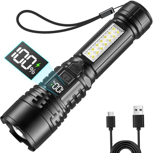 Rechargeable LED Flashlights with Side Lights and Digital Power Display, Zoomable High Lumens Bright Flashlight with Warning Lights for Home and Outdoor Emergency, Camping Essentials, Survival Gear