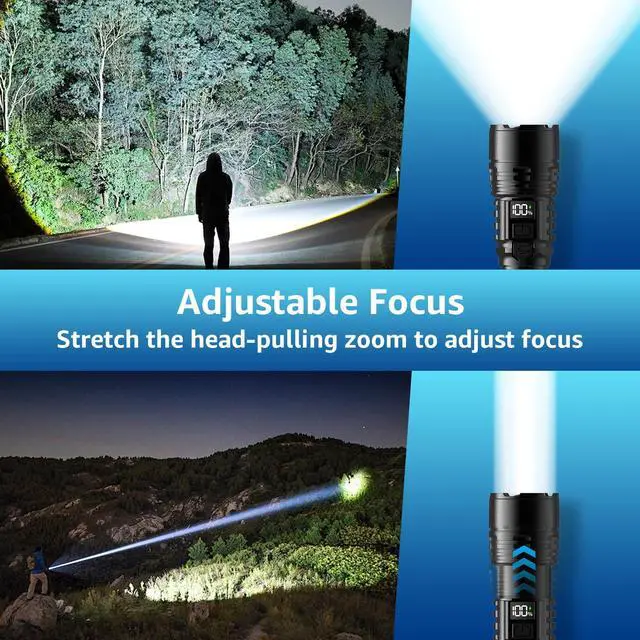 Adjustable focus flood light flashlight :Stretch the head-pulling zoom to adjust focus.