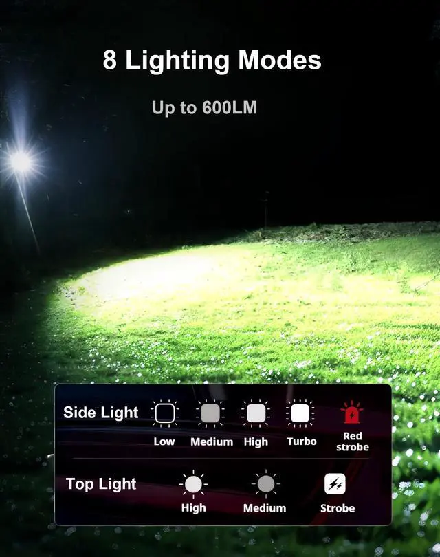 One Button OperationOne button switches the light mode of the top light and side light. It can remember the last brightness mode used (needs to be used for over 10 seconds). In top light mode, double-click the button to turn on the strobe. In side light mode, double-click the button to activate super-bright mode (only lasts 30 seconds).