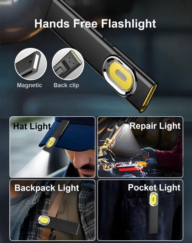 Clip on and Magnetic LightThe strong magnetic base adheres to metal surfaces (cars, tools, and shelving). While the clip secures to the belt, backpack, hat, and tent. Keeping hands free for work or outdoor adventures.