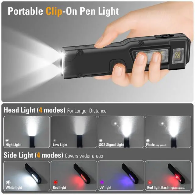 Dual-Switch Multi-Light System with 8 Modes: Two dedicated tail switches enable instant access to main light (High/Low/SOS /Flash) and side light (White/Red/UV + red strobe). No mode cyclingdirect one-click activation ensures tactical readiness for emergencies. Specialized UV Function: Detect stains, authenticate currencies, or identify fluorescent markers with UV lightideal for security, cleaning, and outdoor diagnostics."