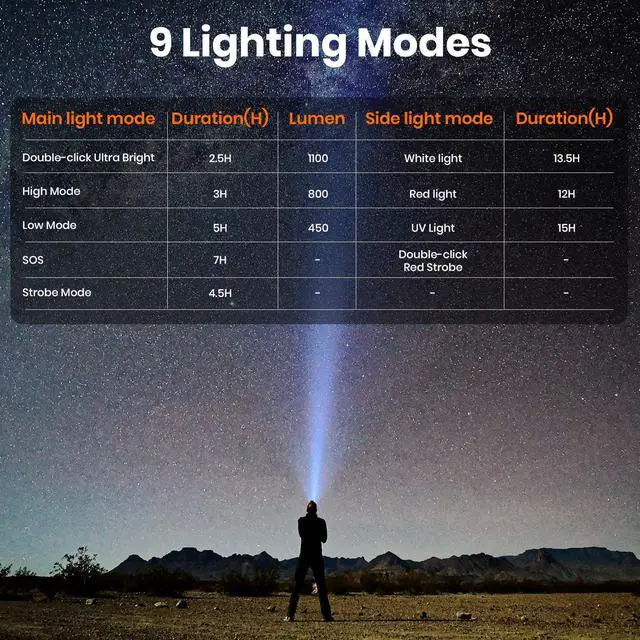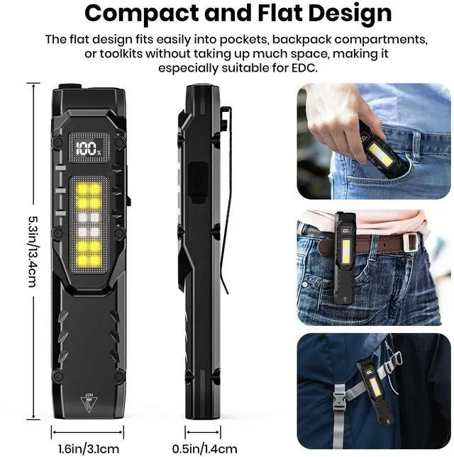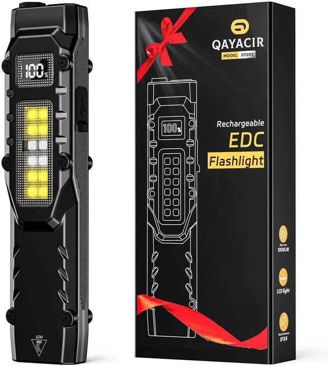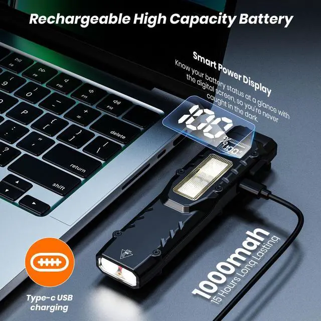 • Engineered for EnduranceUSB-C Charging & Digital Power Indicato: Powered by a built-in 1000mAh rechargeable battery that supports USB charging, the edc flashlight offers a maximum runtime of up to 7 hours for the main light (in SOS mode) and 15 hours for the side light (in UV mode). The integrated digital power display allows you to accurately monitor remaining battery life, eliminating concerns about sudden power failure.