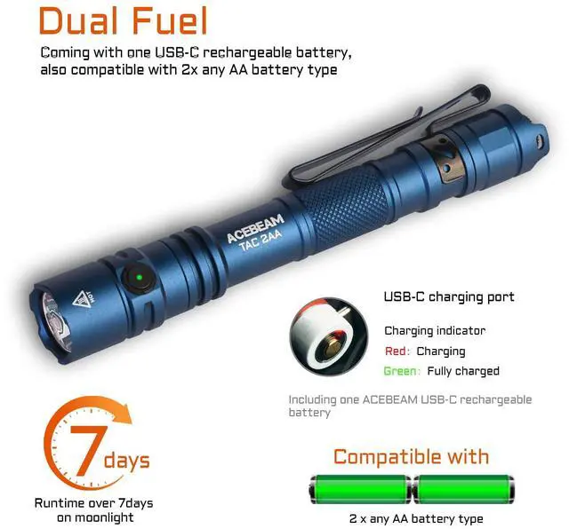 - Rechargeable and 2x AA Flashlight:TAC 2AA Coming with one rechargeable battery, the rechargeable battery can be reused and is more sustainable choice than disposable batteries. The TAC 2AA also compatible with any AA battery type if the rechargeable battery dies and you can't immediately recharge
