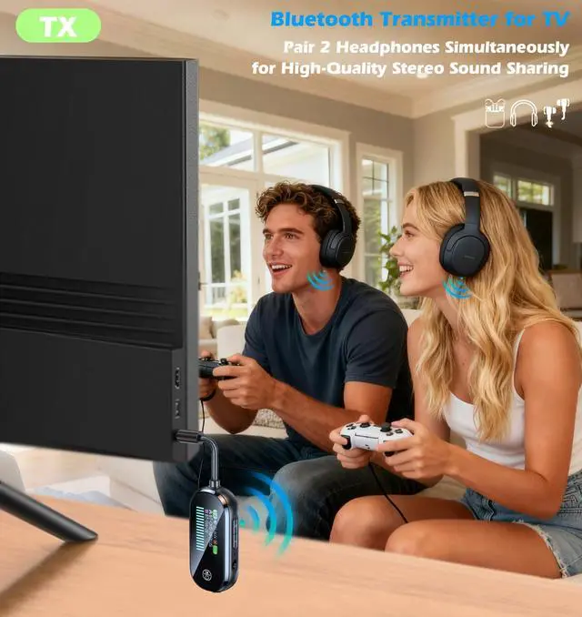 Stream TV sound to 2 pairs of Bluetooth headphones at once with our TV Bluetooth transmitter.