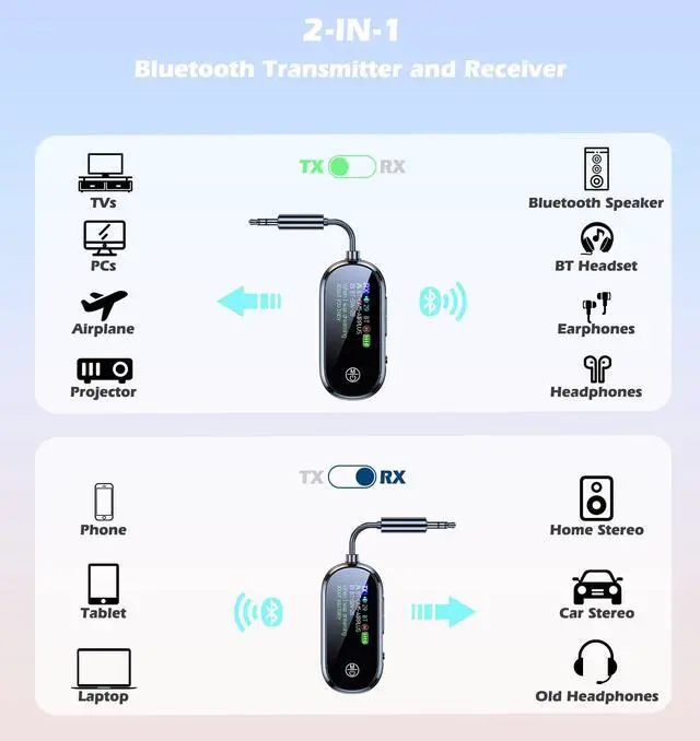 Plug the Wireless audio transmitter into the airplane's 3.5mm audio jack,and you can stream in-flight movies, music, and podcasts wirelessly to your favorite Bluetooth headphones.