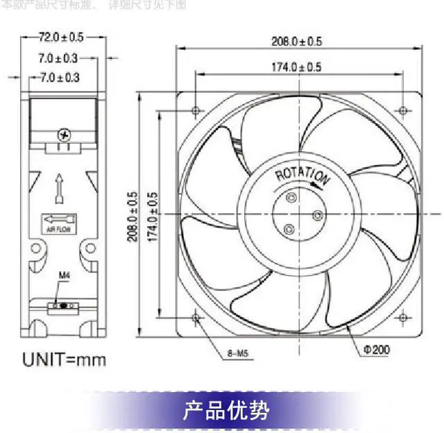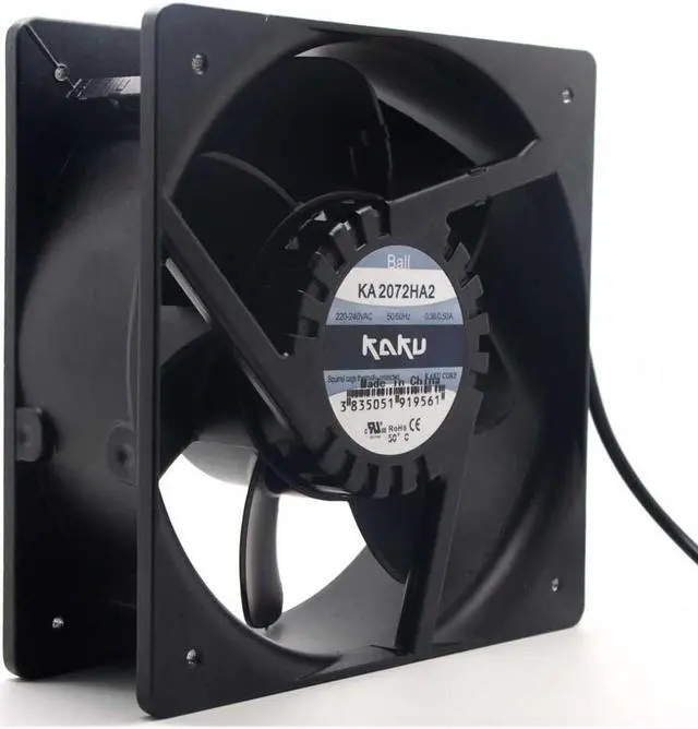 Connection mode: lead wire. Global unique Magnesium alloy frame leaf 208*208*72mm, 174mm, AC220V, Taiwan original KAKU, fan IP55 waterproof and dustproof, magnesium alloy frame and leaf, all metal structure is more resistant to high temperature. If need Insert chipconnection model please contract seller.