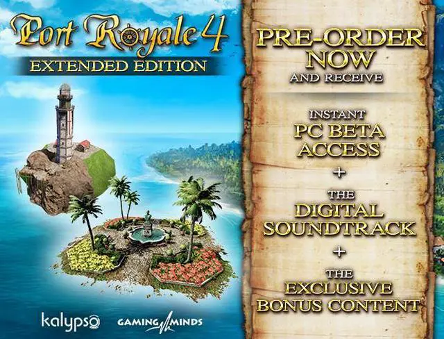 Pre-Order Port Royale 4 Extended Edition now and get instant BETA ACCESS, the DIGITAL SOUNDTRACK and the exclusive BONUS CONTENT, including 4 pompous lighthouses and the blueprints to 5 magnificent parks with varying types of sculptures.