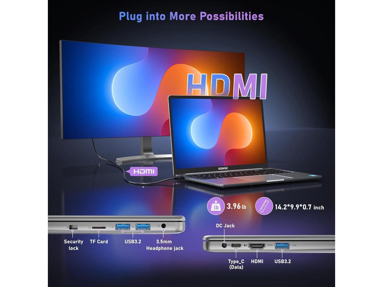 - 3.EASY TO CONNECT ## The windows laptop designed with HDMI Type A X 1, USB3.2 X 3, Type_C(Data) ×1, 3.5mm Headphone jack X 1, 128GB TF Card Socket X 1, DC Jack X 1.