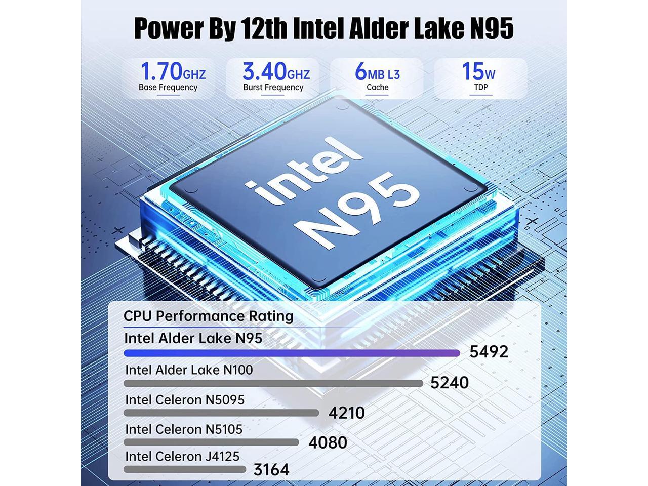 - Powered By Alder Lake N95:KAMRUI AK1PLUS Mini PC features 12th generation Alder Lake N95 Processor (4C/4T, 6MB Cache, base frequency 1.7GHz, up to 3.4GHz).