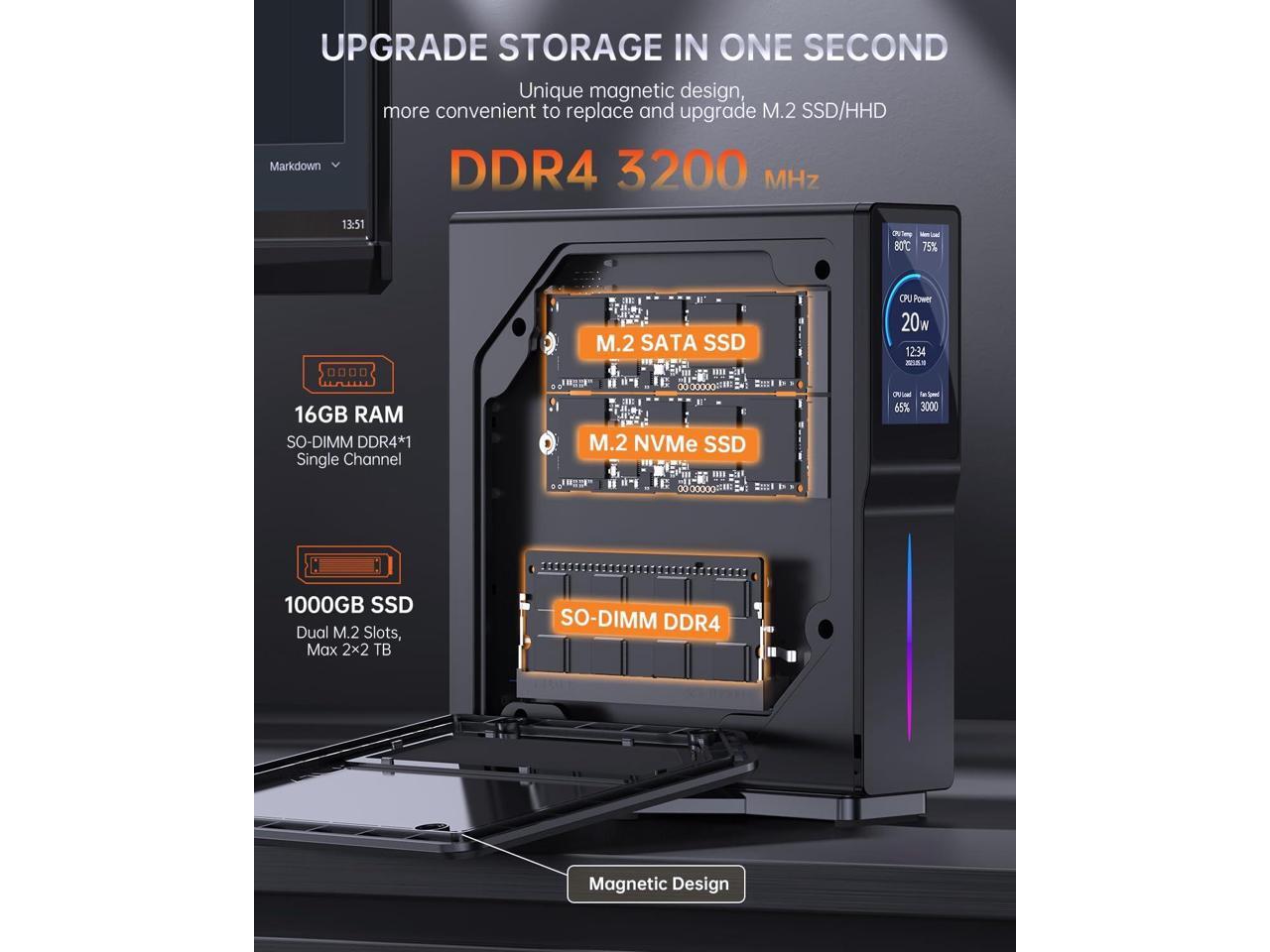 - 2.16GB RAM + 512GB ROM, Upgrade Friendly -- S1 RGB mini pc with 16GB DDR4 3200MHz, 512TB M.2 NVMe SSD (two M.2 slots, one accepts SATA SSD, the other is PCIE/SATA adaptive) , max 4TB. More memory, less latency: This mini computer gives you enough storage space and speed to switch between apps and save all your files. Unique magnetic design, memory expansion in one second.