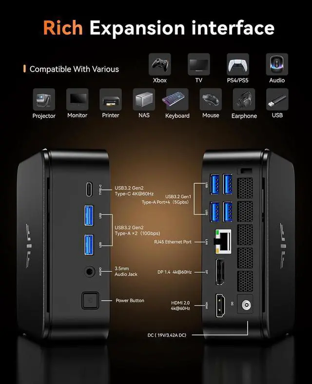 1x 10/100/1000Mbps RJ45 Gigabit Ethernet Port 2x USB3.2 Gen2 Type-A Ports (10Gbps, Front) 4x USB3.2 Gen1 Type-A Ports (5Gbps, Rear) 1x Full-Featured USB3.2 Gen2 Type-C (Supports DP1.4, 4K@60Hz, Max 10Gbps Data Transfer) 1x DC IN (5.5*2.1mm) 1x HDMI 2.0 1x DP1.4b 1x 3.5mm Audio Jack 1x Power Button