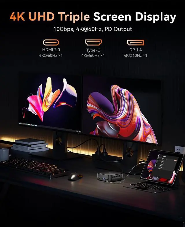 Audio/Video Output: 1x HDMI 2.0 (4K@60Hz), 1x Full-Featured USB3.2 Gen2 Type-C (4K@60Hz), 1x DP1.4b (4K@60Hz) (Supports 3-Screen Display)
