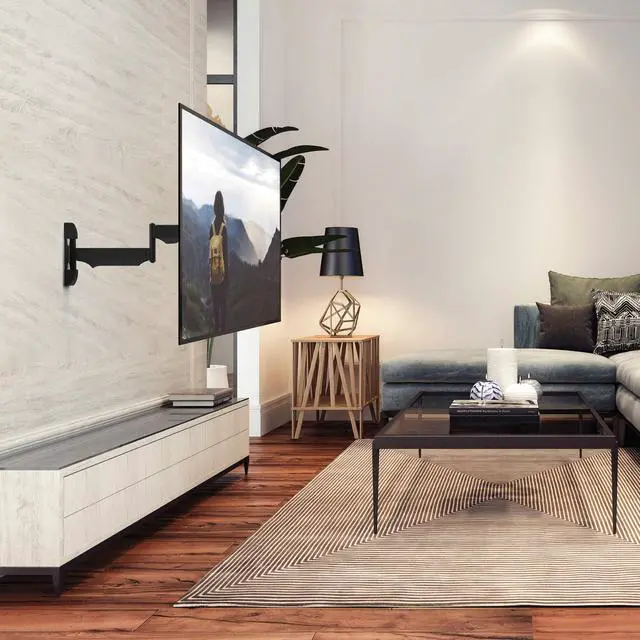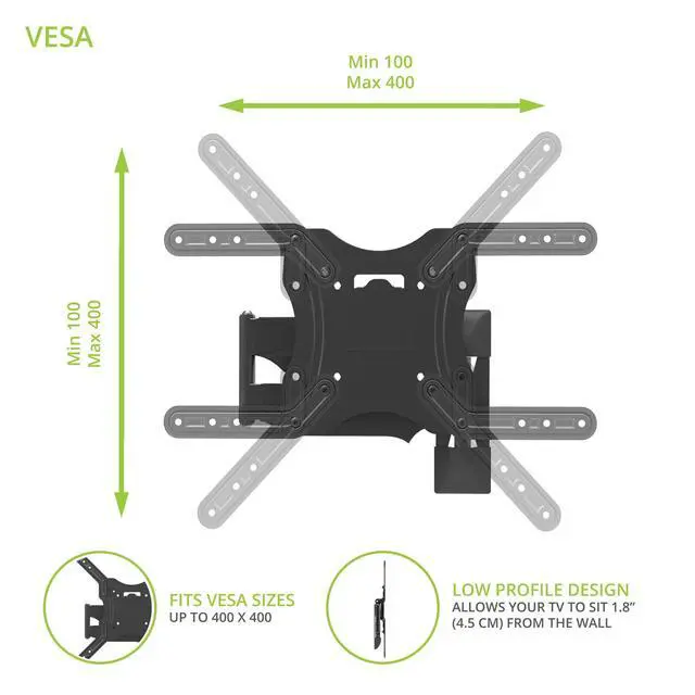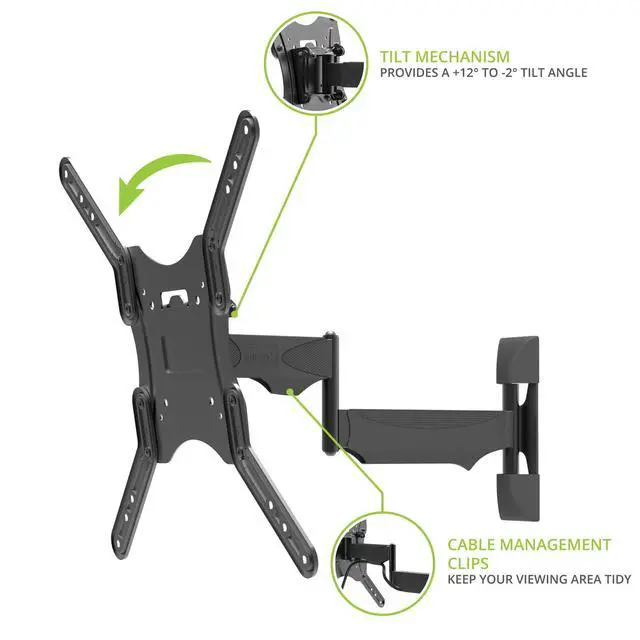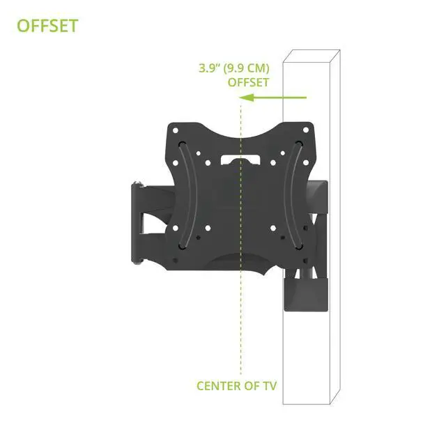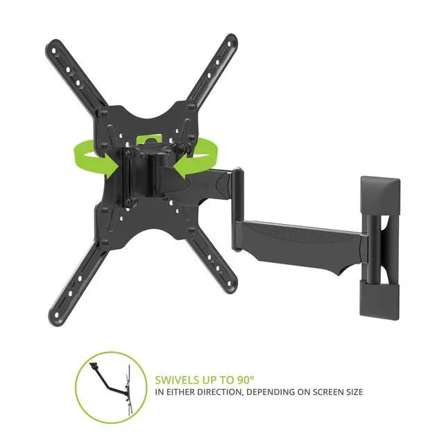 The Kanto M200 single-stud TV mount allows you to achieve a wide range of viewing angles without taking up a large amount of wall space. Providing 18.6 inches of extension, its articulating support arm provides easy swivel, pan and tilt adjustments to improve line-of-sight with your TV. The arm can also be pushed back to place your TV 1.8 from the wall, with the center of the screen sitting 3.9 inches to the left or right of the wall TV mounting plate. Featuring snap-on cable management clips and wall plate covers, this pan and tilt mount provides a clean and low-profile solution to your TV mounting needs. The Kanto M200s narrow TV mounting plate is designed to fit on a single wood stud while safely supporting up to 60 pounds. Anchors are also provided for brick and concrete installations. Measuring 18.6 long, the articulating arm allows for a wide range of viewing angles. Swivel your TV 51° to 90° in either direction, depending on screen size, and tilt it up to 12° forward to improve line-of-sight and 2° backward to reduce glare. Achieve a remarkably low-profile setup by pushing your TV back to sit 1.8 from the wall. Note that the center of your TV will be situated 3.9 to the left or right of the wall TV mounting plate when fully pushed back. Use the provided cable management clips with the Kanto M200 to conveniently route your cables, ensuring your viewing area remains clutter-free. Plastic wall plate covers are also included to hide any sign of installation. Whats Included +12° to -2° Tilt Up to 90° Swivel (left or right) 18.6 18.6 Material: Solid steel construction with durable powder coated finish 100×100, 150×100, 200×100, 200×150, 200×200, 200×300, 200×400, 300×200, 300×300, 400×200, 400×300, 400×400 TV Sizes: 26 to 50 Weight Allowance: 60 lb (27 kg) VESA Sizes: 100×100, 150×100, 200×100, 200×150, 200×200, 200×300, 200×400, 300×200, 300×300, 400×200, 400×300, 400×400 Offset: 3.9 left or right of wall plate Profile: 1.8 (4.5 cm) Shipping box weight: 8.6 lb (3.9 kg) Shipping box dimensions: 12.8 x 10.2 x 2.8 (32.5 x 25.5 x 7 cm) Product weight: 6.6 lb (3 kg) UPC: 800152015613