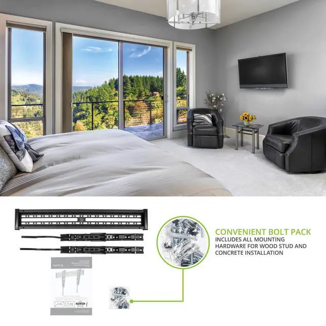 The KT3260 is a tilting TV wall mount wide enough to fit even custom 24” stud centers. While most construction uses 16” stud centers, there are many applications where 24” centers are needed – the KT3260 wall plate is wide enough to fit both. With its low-profile design, range of VESA patterns and flexible tilting mechanism, this mount is a great fit for TVs between 32” and 60”. It’s also built with adjustable quick-release cords making it easy to remove your TV from the wall and access cables.