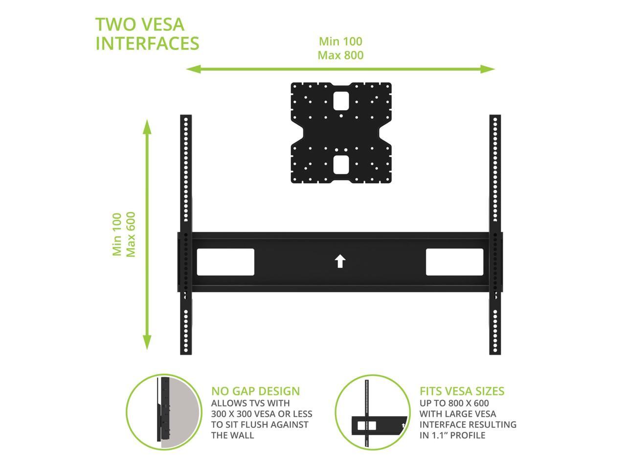 - PERFECTLY FLUSH R600 is a true zero gap TV mount that allows TVs with a VESA pattern of 300x300 or less to sit directly against the wall for a completely flush look. The profile only increases to 1.1 if using the 400 mm VESA extensions