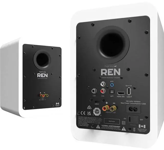 Kanto RENMW Powered Bookshelf Speakers - 1" Silk Dome - 5.25" Aluminum Concave Cone - Class D Amplifier - 50 Hz / 22 kHz Frequency Response - 80 Hz (Automatic) High/Low-Pass Filter - 1 HDMI - 1 USB-C - 1 Optical - Bluetooth - 1 RCA - 1 Mini-Jack - 1 Sub-out - 1 x USB Charge 5V - Vocal Boost - Night Mode - Active to Passive knurled Five-way Binding Post - 1/4"-20 Bottom Mounting Hole - AC 100V Input Voltage - Frequency 240V 50/60 Hz - Auto Power Down/UP -