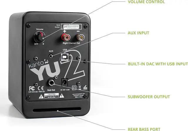 Use the AUX input with the included Kanto 3.5mm cable to connect any device with a headphone jack to your YU2. Lighten the load on your computer CPU by connecting directly to YU2 built-in DAC via a USB cable for a fully digital, high-quality audio connection. If you want a little more kick, connect a powered subwoofer to the sub-out port.