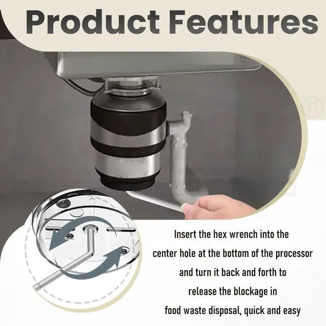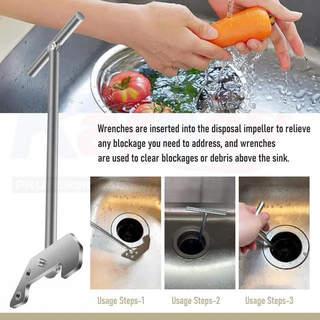 - Insert the wrench into the processor impeller to resolve stubborn clogs in your kitchen sink. Quickly release the device and restore smooth operation, effortlessly clearing plastic film or debris.