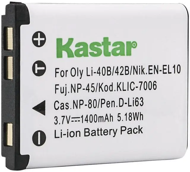 Bullet Point 1 Kastar Brand Replacement Lithium-ion (Li-ion) Battery. High Quality, Long Lasting and Manufacture Price. Bullet Point 2 Kastar Decoded Battery Compatible with the Original Battery and Charger. Bullet Point 3 Kastar Battery High Capacity. Use high quality Cells for longer battery life with no Memory Effect. Bullet Point 4 Use Integrated Japanese microchip which can prevent the overcharge and overdischarge. Bullet Point 5 Compatible Item List: Olympus LI-40B, LI-42B, Fuji NP-45, Kodak KLIC-7006, Nikon EN-EL10, Casio NP-80, Pentax D-LI63 Description Details Compatible Item List: Olympus LI-40B, LI-42B, Fuji NP-45, Kodak KLIC-7006, Nikon EN-EL10, Casio NP-80, Pentax D-LI63 Quality Price Value