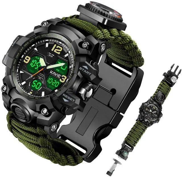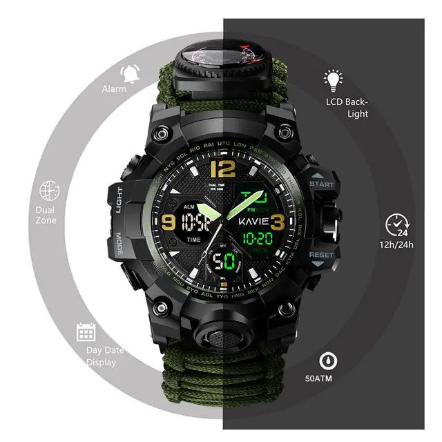 Dual Display Military WatchThis is the most practical digital sports watch with super functional bracelet band , providing tons of uses to meet every potential need during outdoor survival. Supports both digital and analog displays, provides 2 different time zones for simultaneous setup and reading.