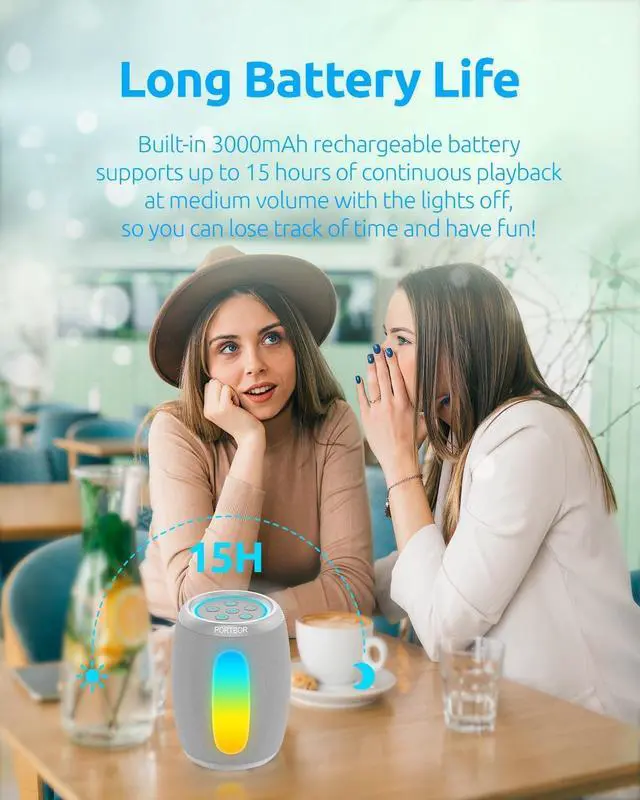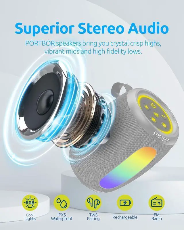 The PORTBOR is a small size Bluetooth speaker but delivers powerful and crystal-clear stereo sound. With a strong midrange, clear bass, and full treble, you'll experience a rich and immersive and shocking listening experience that will transport you to another world!
