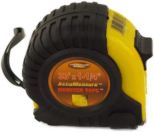 KC Professional, 79433TP, 1-1/4" x 33' Accumeasure Wide Monster Tape Measure, Contractor Quality, Extra Heavy Duty Rubber Case, Power Locking, Easy To Read Tape, Positive Toggle Lock, Rivet Corrosion Resistant Hook, Hi-Impact Hi-Viz Yellow Plastic Case With Rubber Jacket, Removable Belt Clip.