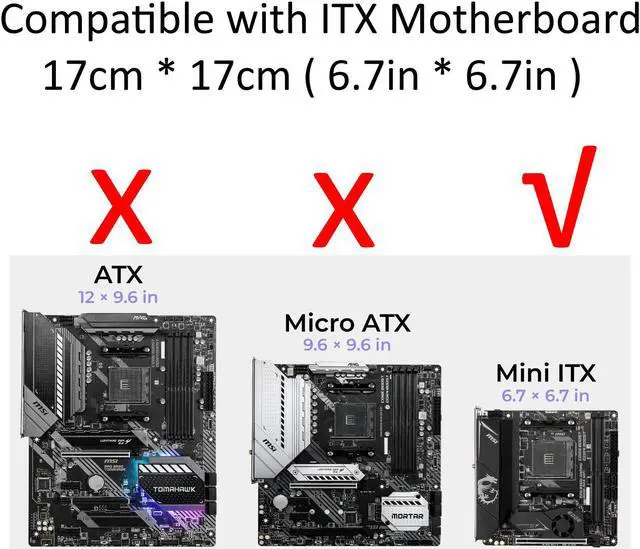 • [Support Mini ITX Motherboard] ITX Motherboard dimension 6.7*6.7in (17*17cm).