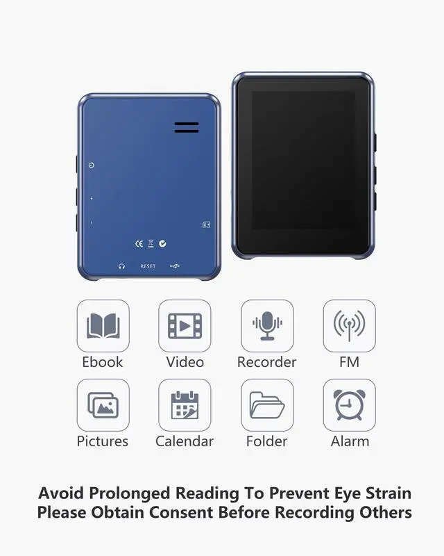 • Multifunctional Media Player (Video/FM/Voice) Includes FM Radio(requires wired headphones for use) Digital Voice Recorder for quick memos(please respect privacy laws) E-Book Reader(Eye Care Tip:avoid long reading) Video Player for AMV/AVI(contact support for MP4 converter).