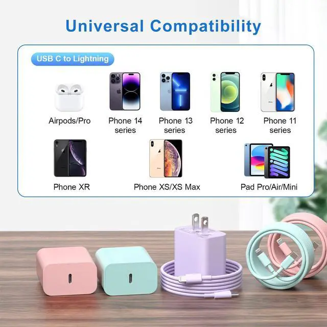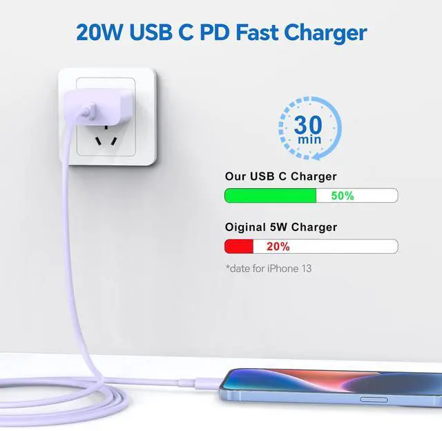 [3.0 Fast Charger]:3.0 PD Purple/Blue/Red 20W Fast Charger with USB C to ightning Cable charges your device three times faster than original 5W charger, charging your Phone 14 to 50% in just 30 minutes.