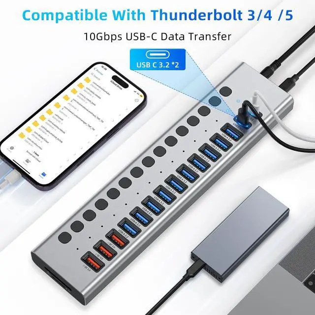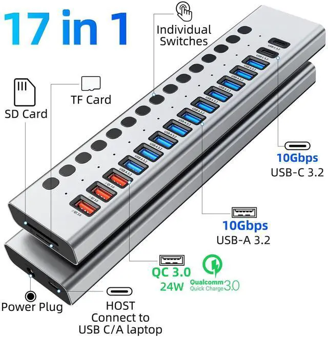 17 IN 1 Powered USB 3.2 Hub: powered usb 3.2/ powered usb c hub equips with 10 x USB 3.2 ports, 3 x USB-A smart charging ports, 2 x USB-C 3.2 ports, 1× SD/TF cards reader. The usb 3.2 port(up to 10gbp/s) provide you super speed data transfer, while the usb charging-only ports provide 5V/2.4A power to charge your phone, tablet and so on.