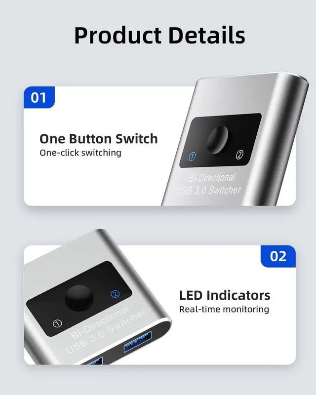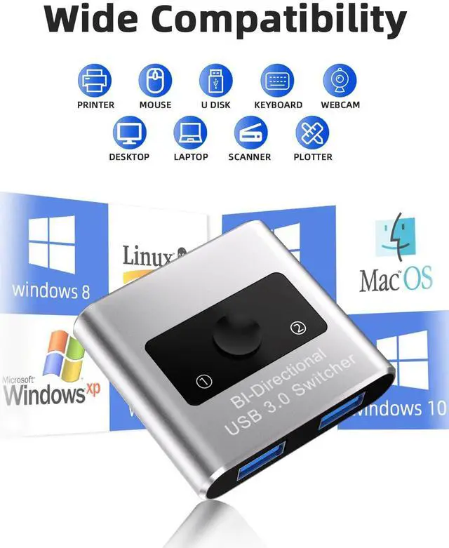 Bi-directional USB 3.0 Switch and Hub Work as a USB Switch - 1 in 2 out USB 3.0 Switch is an excellent choice to share 1 USB 3.0 device between two systems, ideal for sharing a printer or scanner in a small office environment. It's also great for home use with multiple PCs or Macs. Mostly used for printer switch 2 computers to 1 printer. Work as a hub - This USB switcher supports 1 computer to expand 2 more USB 3.0 ports. USB switch also supports connection with Hubs - If connected with another external hub, more available USB ports can be expanded. Universal USB 3.0 Device: --- This USB Switch would work with all USB 3.0 devices, such as external hard disk, USB hub, USB flash drive, high-resolution webcam, multi-channel audio and more. --- USB 3.0 Ultra-Fast Speed - USB 3.0 Switch supports ultra-fast USB 3.0 data transfer rates of up to 5 Gbps (10 times faster than USB 2.0). Easy Installation --- This USB 3.0 switch is plug-and-play on Windows/Linux/macOS/Chrome OS, no additional driver installation is needed. Please note: 1. This switch requires manual control to select the active computer port; it does not 'automatically' switch between ports. 2. Use the provided 1.5M cables to connect the USB switch to your computers and keep the USB cable that connects your peripheral to the USB switch under 6ft/1.8m. 3. 2.4 GHz wireless devices, such as wifi, wireless keyboard and mouse adapters, may not work stable near USB 3.0 devices. Try using the host port or a USB 2.0 connection.